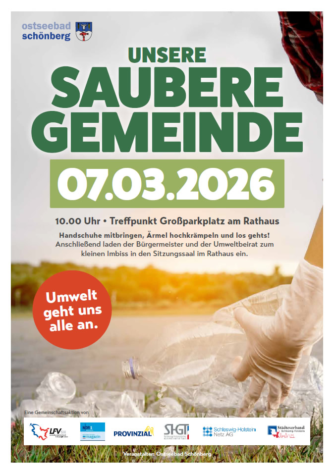auch in diesem Jahr beteiligt sich unsere Gemeinde an der landesweiten Umweltaktion „Unser sauberes Schleswig-Holstein“. Der Bürgermeister Peter A. Kokocinski und die Vorsitzende des Umweltbeirats Frau Christel Simmich laden Sie herzlich ein, gemeinsam aktiv zu werden und Schönberg von achtlos weggeworfenem Müll zu befreien.